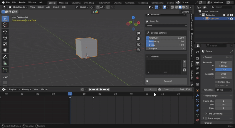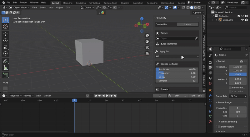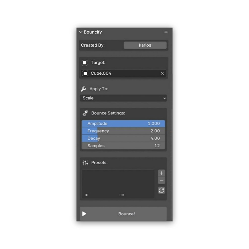 Bouncify is a customizable Blender addon that adds smooth, natural overshoot bounce animations to your objects, its perfect for motion graphics, product animations, UI animations, and any project that needs that professional polish.
